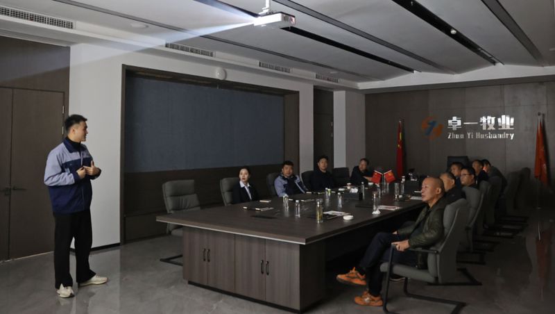 实地考察后考察团来到行政会议室,观看产品方案、感受公司文化。了解公司设备的原材料供应、运行原理、人性化设计等方面进行针对性介绍。随后,考察团共同观看卓一牧业大型种鸡、肉鸡项目案例介绍,就百万羽规模大型养殖基地相关议题进行深入讨论交流。